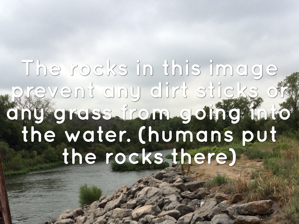 The rocks in this image prevent any dirt sticks or any grass from going into the water. (humans put the rocks there)