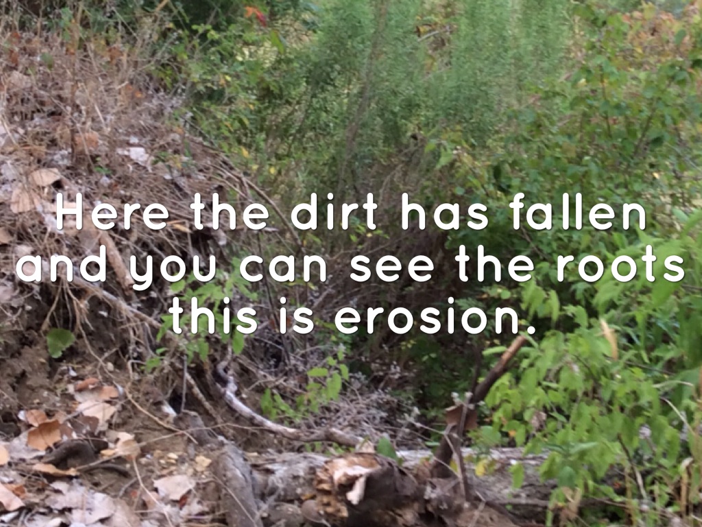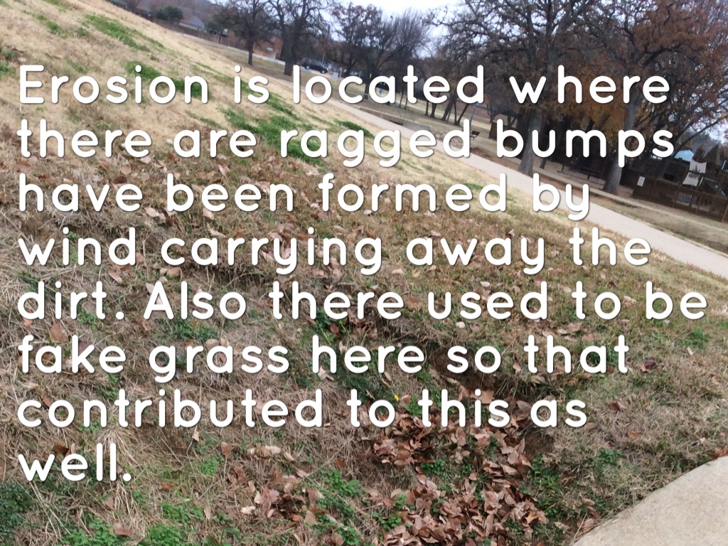 Erosion is located where there are ragged bumps have been formed by wind carrying away the dirt. Also there used to be fake grass here so that contributed to this as well.