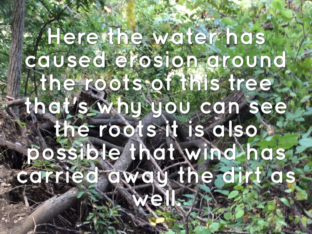 Here the water has caused erosion around the roots of this tree that's why you can see the roots it is also possible that wind has carried away the dirt as well.