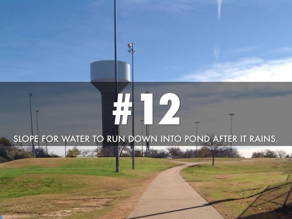 SLOPE FOR WATER TO RUN DOWN INTO POND AFTER IT RAINS.
