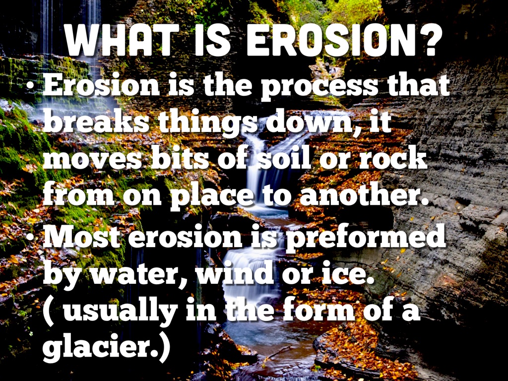 Erosion is the process that breaks things down, it moves bits of soil or rock from on place to another.