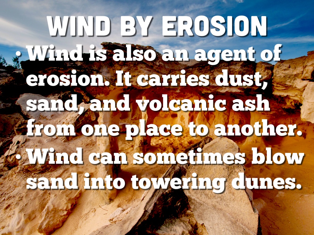 Wind is also an agent of erosion. It carries dust, sand, and volcanic ash from one place to another.