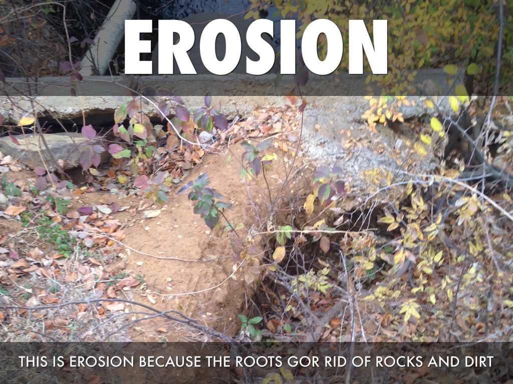THIS IS EROSION BECAUSE THE ROOTS MOVED THE DIRT AND SPLIT THE ROCK