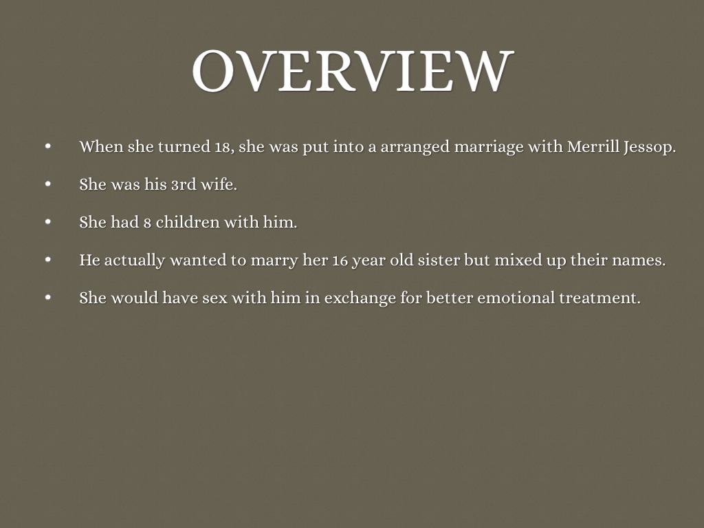 When she turned 18, she was put into a arranged marriage with Merrill Jessop.