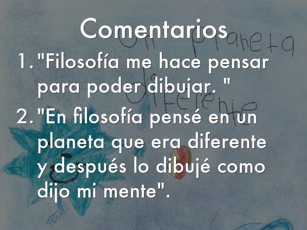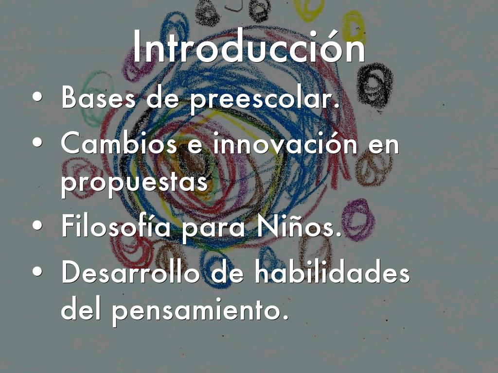 https://www.haikudeck.com/p/ca01eee096/escribiendo-historias La filosofía en preescolar pretende expresar lo contrario a lo tradicional, busca desarrollar habilidades del pensamiento en los infantes, fomentar en ellos la habilidad de pensar por sí mismo y que sean quienes descubran al mundo donde viven, a través del desarrollo de su curiosidad, cuestionamientos y, sobre todo, impulsándolos a investigar, innovar, imaginar y compartir en una comunidad de diálogo, donde prevalezca el lenguaje como una forma de comunicación y expresión de ideas, pero razonadas. Dewey lo planteaba cuando asentaba que la educación debería ser definida como la capacidad de pensar.