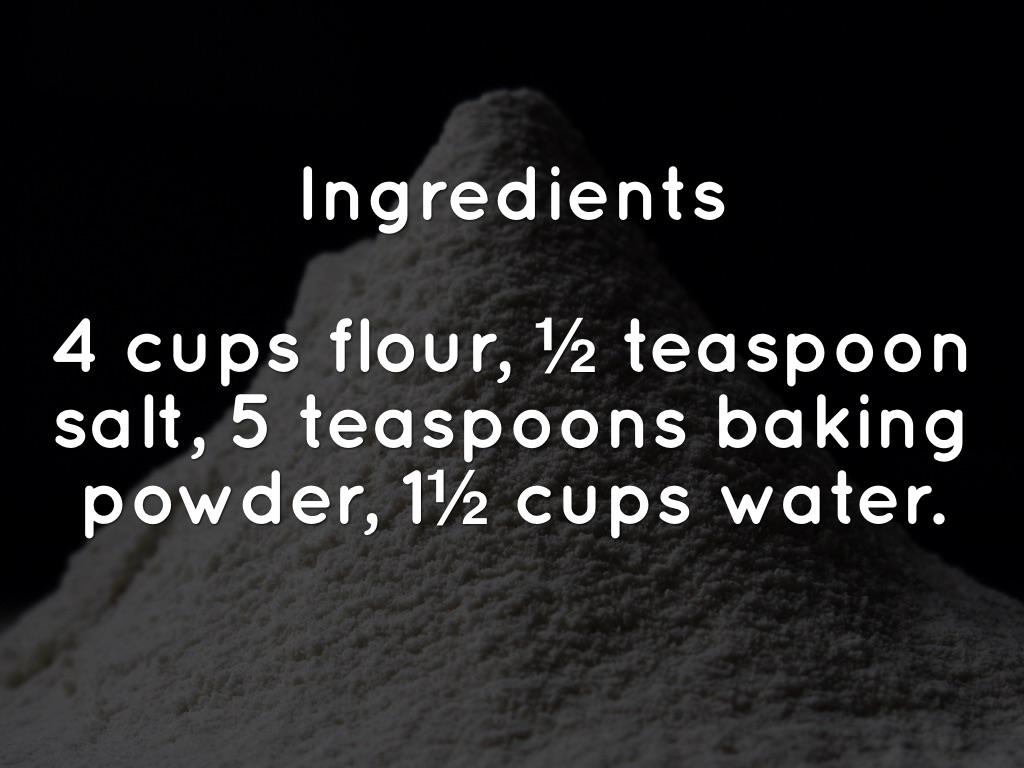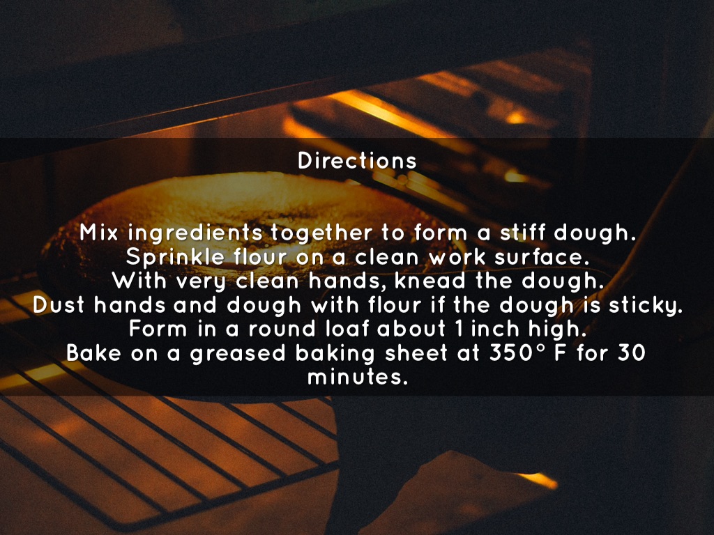 Mix ingredients together to form a stiff dough. Sprinkle flour on a clean work surface. With very clean hands, knead the dough. Dust hands and dough with flour if the dough is sticky. Form in a round loaf about 1 inch high. Bake on a greased baking sheet at 350° F for 30 minutes.