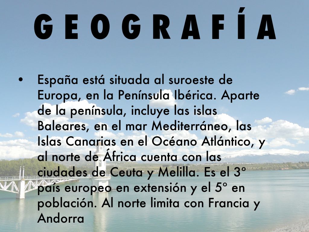 España está situada al suroeste de Europa, en la Península Ibérica. Aparte de la península, incluye las islas Baleares, en el mar Mediterráneo, las Islas Canarias en el Océano Atlántico, y al norte de África cuenta con las ciudades de Ceuta y Melilla. Es el 3º país europeo en extensión y el 5º en población. Al norte limita con Francia y Andorra