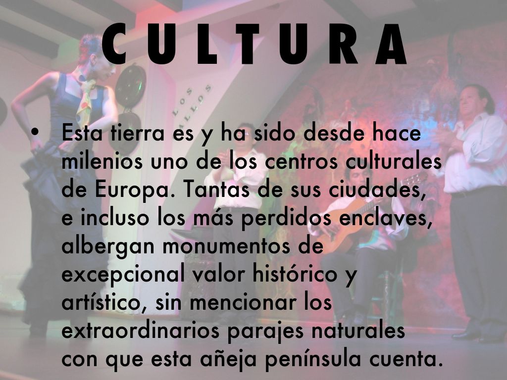Esta tierra es y ha sido desde hace milenios uno de los centros culturales de Europa. Tantas de sus ciudades, e incluso los más perdidos enclaves, albergan monumentos de excepcional valor histórico y artístico, sin mencionar los extraordinarios parajes naturales con que esta añeja península cuenta.