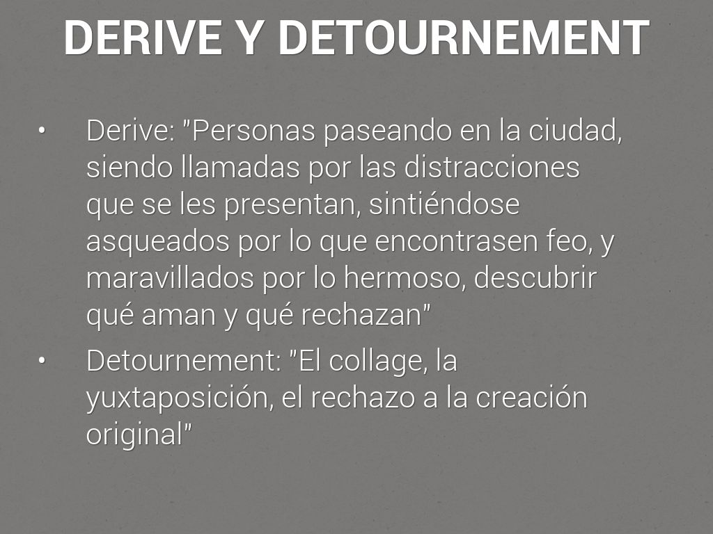 • Derive: "Personas paseando en la ciudad, siendo llamadas por las distracciones que se les presentan, sintiéndose asqueados por lo que encontrasen feo, y maravillados por lo hermoso, descubrir qué aman y qué rechazan"