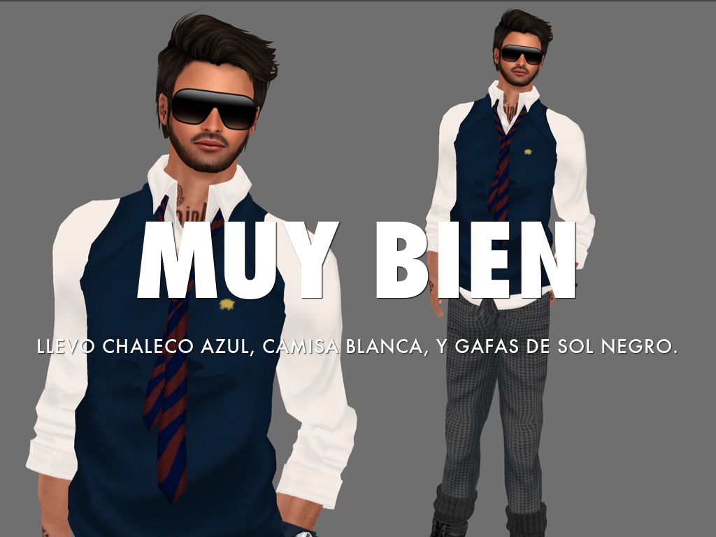 LLEVO CHALECO AZUL, CAMISA BLANCA, Y GAFAS DE SOL NEGRO.