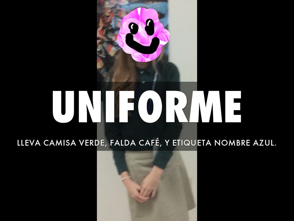 LLEVA CAMISA VERDE, FALDA CAFÉ, Y ETIQUETA NOMBRE AZUL.