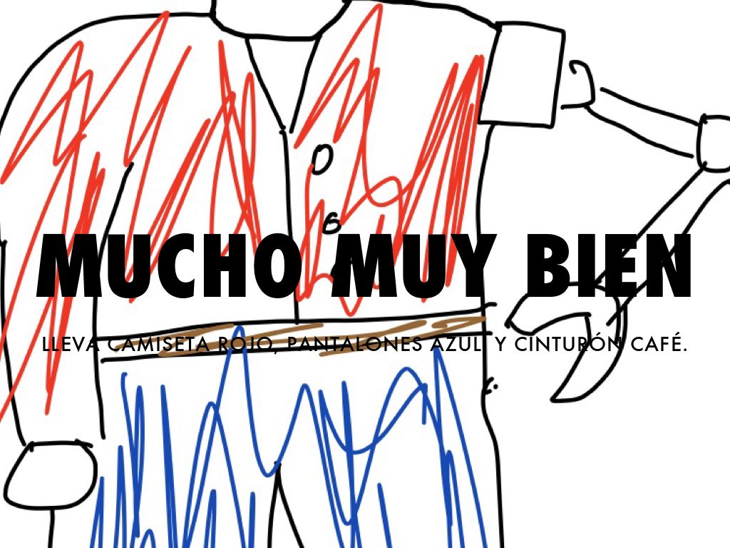 LLEVA CAMISETA ROJO, PANTALONES AZUL, Y CINTURÓN CAFÉ.