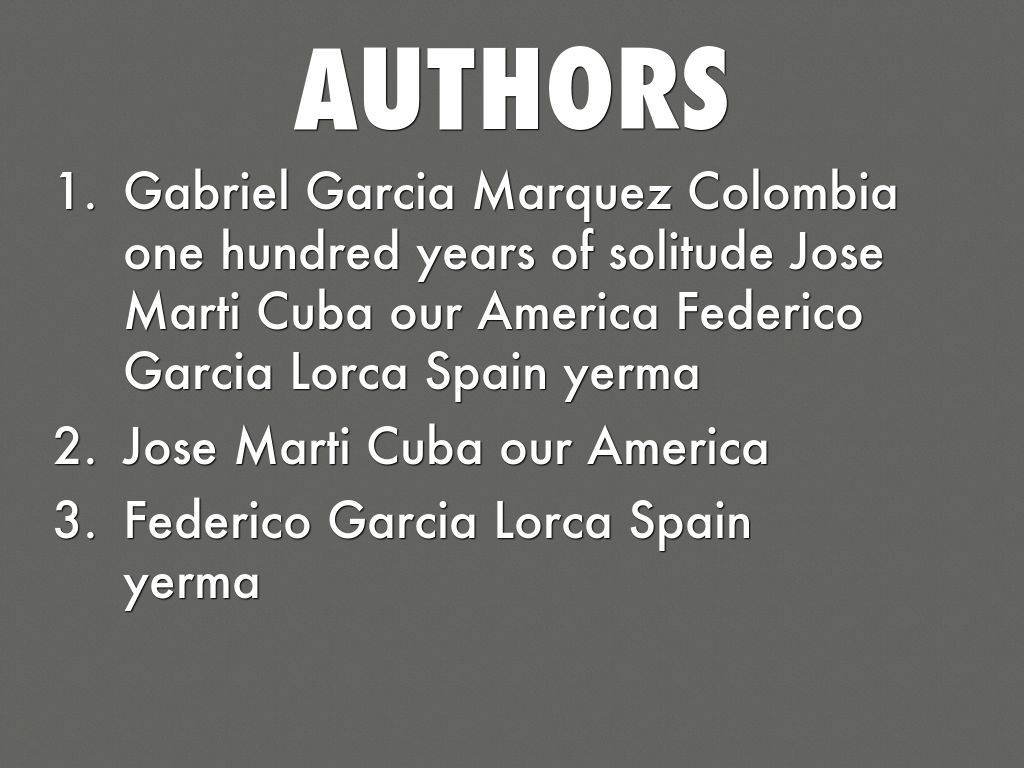 Gabriel Garcia Marquez Colombia one hundred years of solitude Jose Marti Cuba our America Federico Garcia Lorca Spain yerma