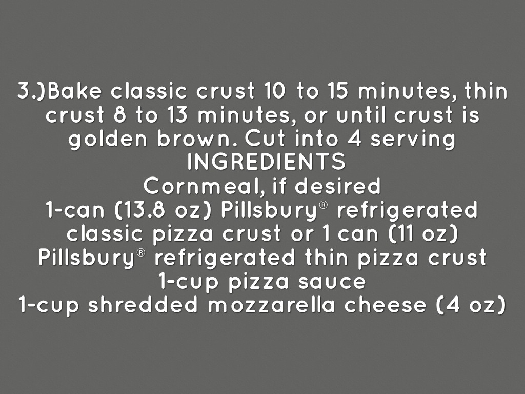 3.)Bake classic crust 10 to 15 minutes, thin crust 8 to 13 minutes, or until crust is golden brown. Cut into 4 servings.