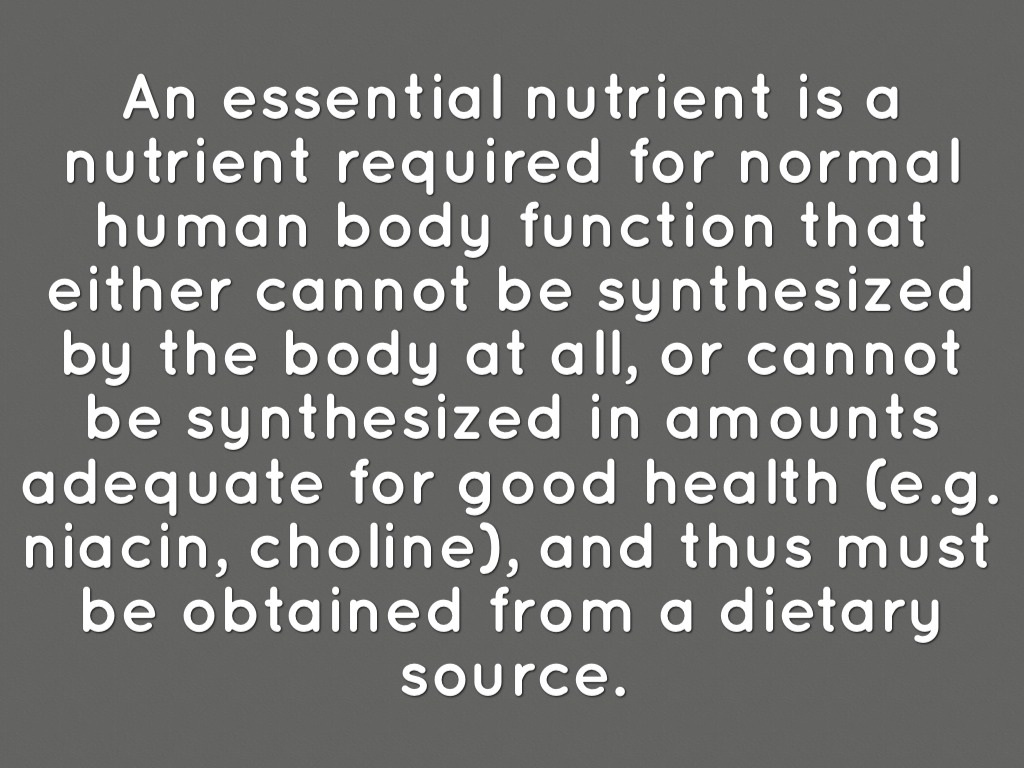 An essential nutrient is a nutrient required for normal human body function that either cannot be synthesized by the body at all, or cannot be synthesized in amounts adequate for good health (e.g. niacin, choline), and thus must be obtained from a dietary source.
