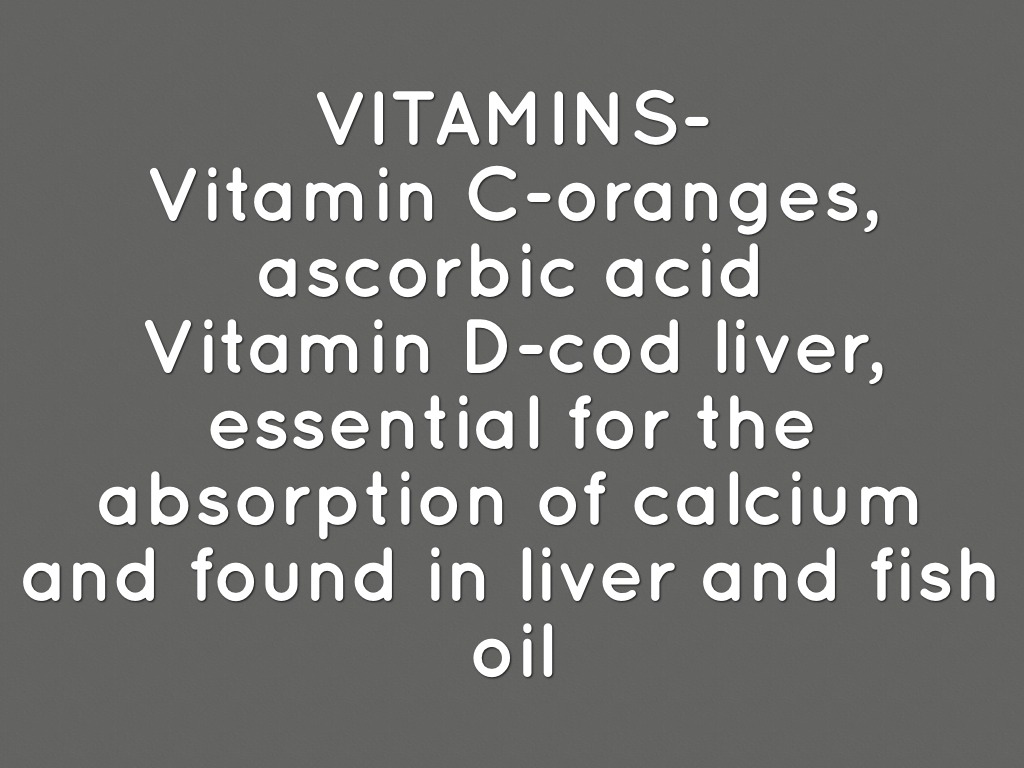 Vitamin D-cod liver, essential for the absorption of calcium and found in liver and fish oil