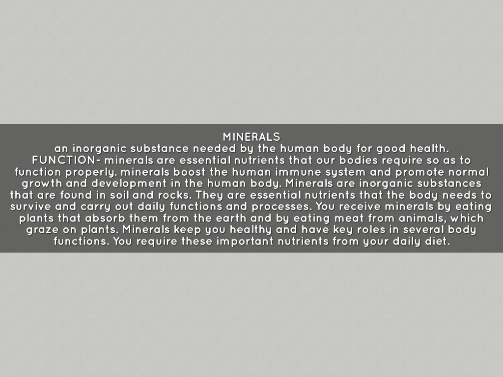 FUNCTION- minerals are essential nutrients that our bodies require so as to function properly. minerals boost the human immune system and promote normal growth and development in the human body. Minerals are inorganic substances that are found in soil and rocks. They are essential nutrients that the body needs to survive and carry out daily functions and processes. You receive minerals by eating plants that absorb them from the earth and by eating meat from animals, which graze on plants. Minerals keep you healthy and have key roles in several body functions. You require these important nutrients from your daily diet.