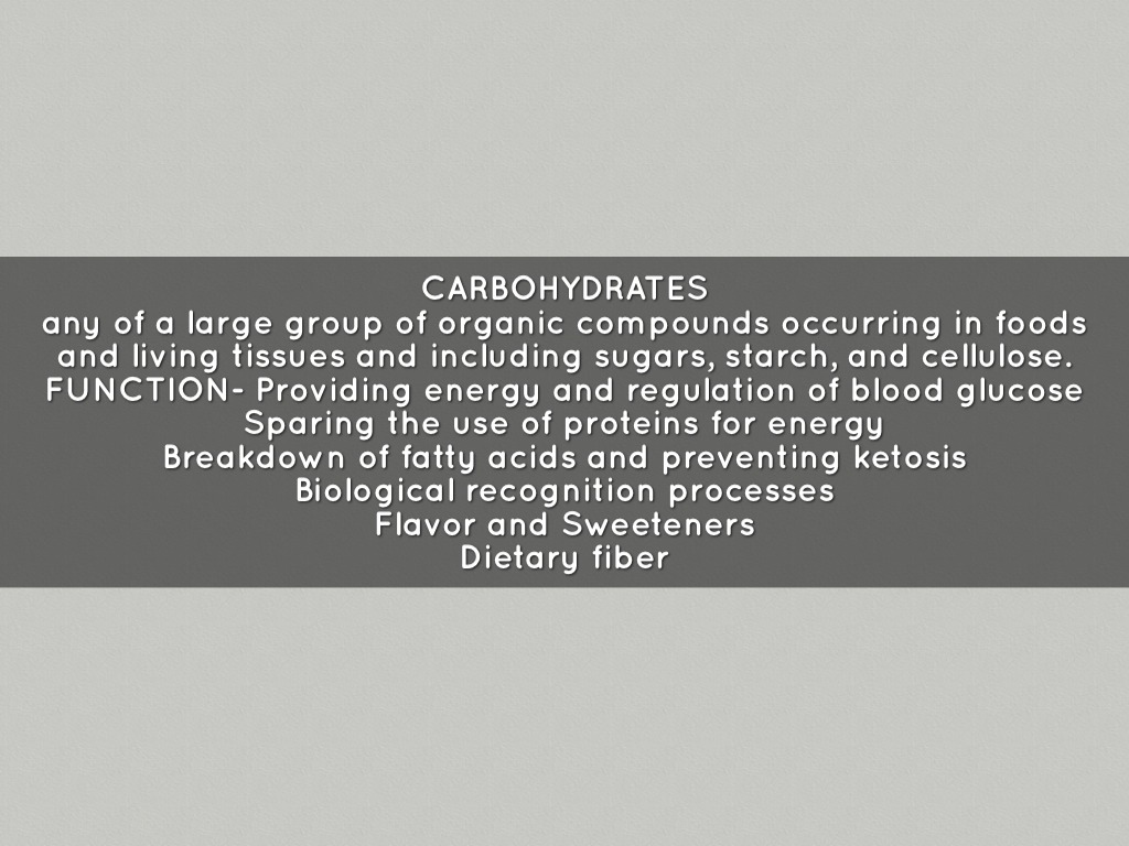 any of a large group of organic compounds occurring in foods and living tissues and including sugars, starch, and cellulose.