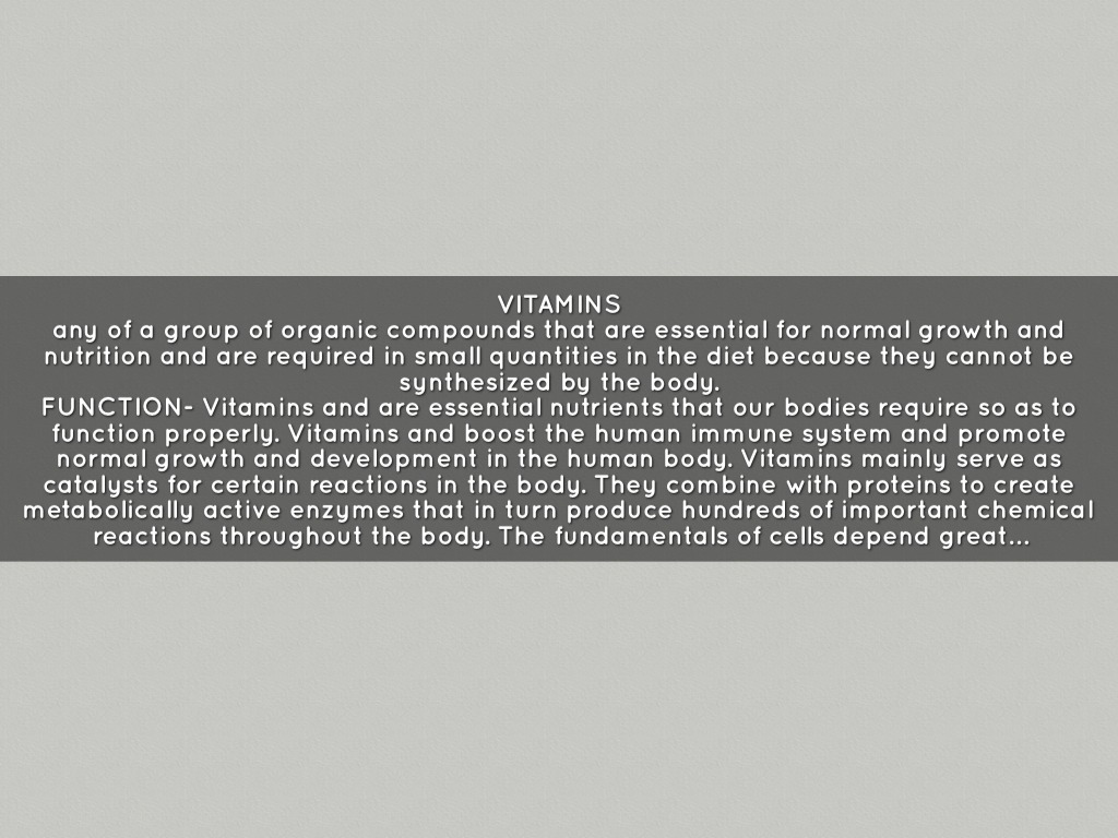 FUNCTION- Vitamins and are essential nutrients that our bodies require so as to function properly. Vitamins and boost the human immune system and promote normal growth and development in the human body. Vitamins mainly serve as catalysts for certain reactions in the body. They combine with proteins to create metabolically active enzymes that in turn produce hundreds of important chemical reactions throughout the body. The fundamentals of cells depend greatly upon vitamins. Vitamins are responsible for keeping cells strong, binding tissues, fighting infections, etc. Without vitamins our cells would not function properly and thus our organs would suffer and eventually we would no longer be able to survive. Vitamins help regulate metabolism, help convert fat and carbohydrates into energy, and assist in forming bone and tissue.