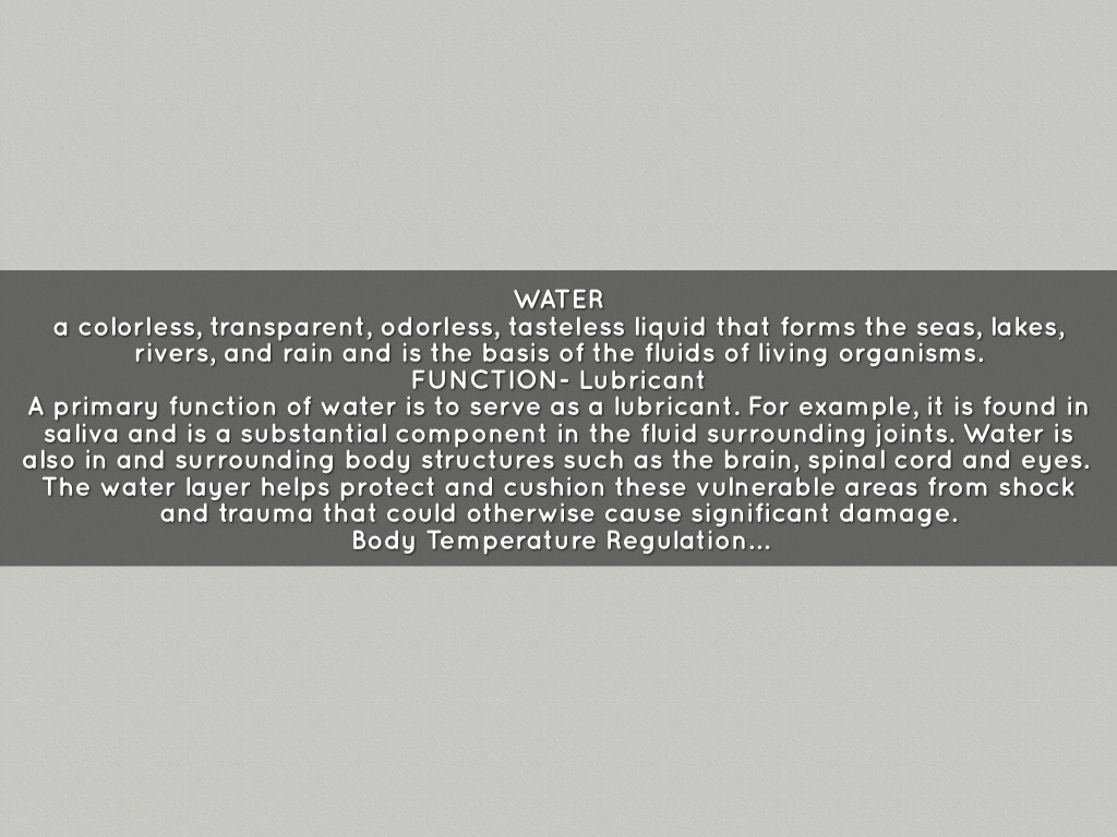 A primary function of water is to serve as a lubricant. For example, it is found in saliva and is a substantial component in the fluid surrounding joints. Water is also in and surrounding body structures such as the brain, spinal cord and eyes. The water layer helps protect and cushion these vulnerable areas from shock and trauma that could otherwise cause significant damage.