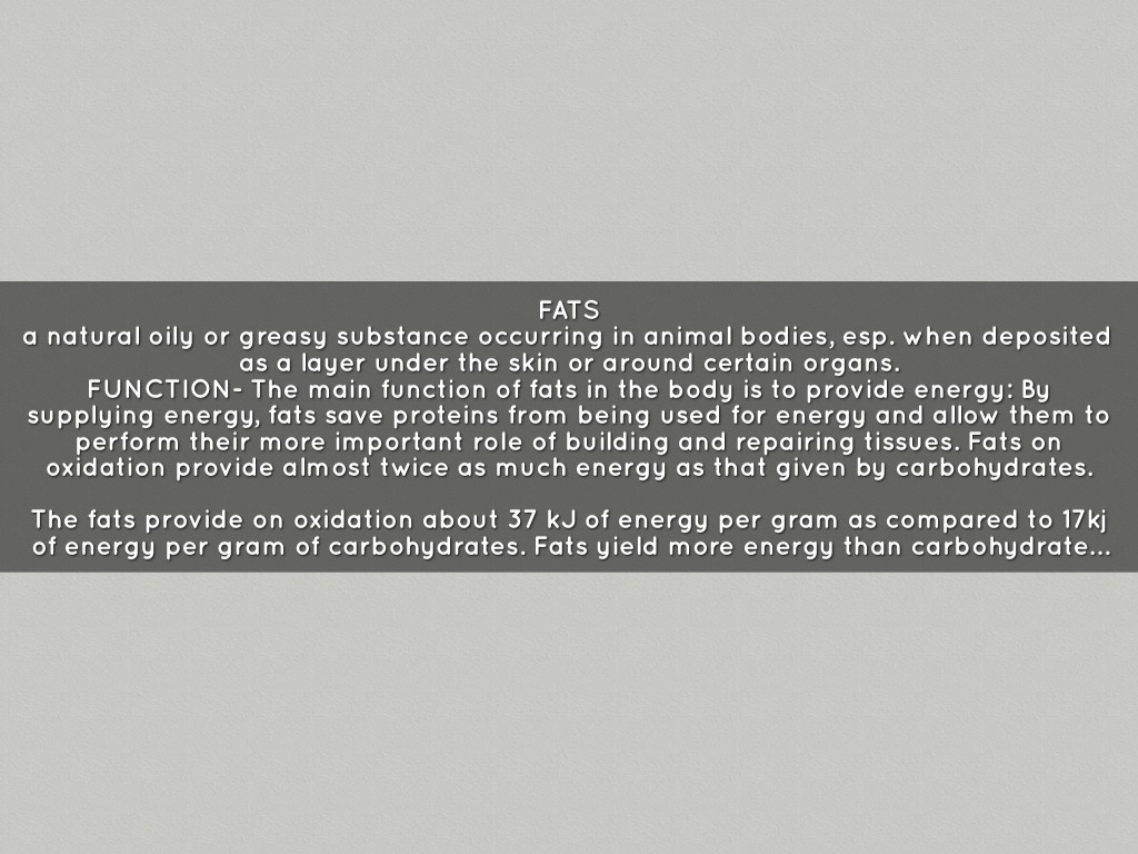 FUNCTION- The main function of fats in the body is to provide energy: By supplying energy, fats save proteins from being used for energy and allow them to perform their more important role of building and repairing tissues. Fats on oxidation provide almost twice as much energy as that given by carbohydrates.