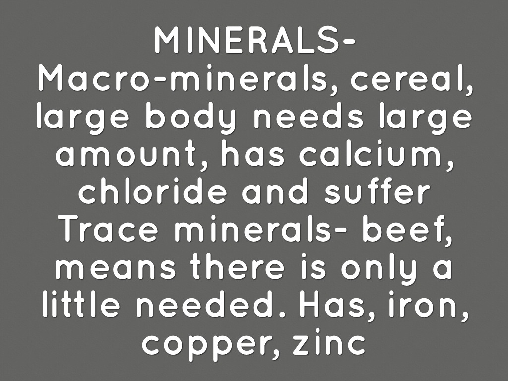 Macro-minerals, cereal, large body needs large amount, has calcium, chloride and suffer