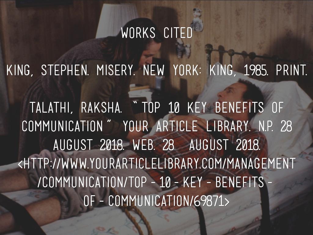 Similarly, in “Misery” Annie controls Paul by how much medication she gives him, sometimes she will try to put him to sleep if she wants him to rest or if he does not want to do something for her, she takes his medication away until he does what she wants.