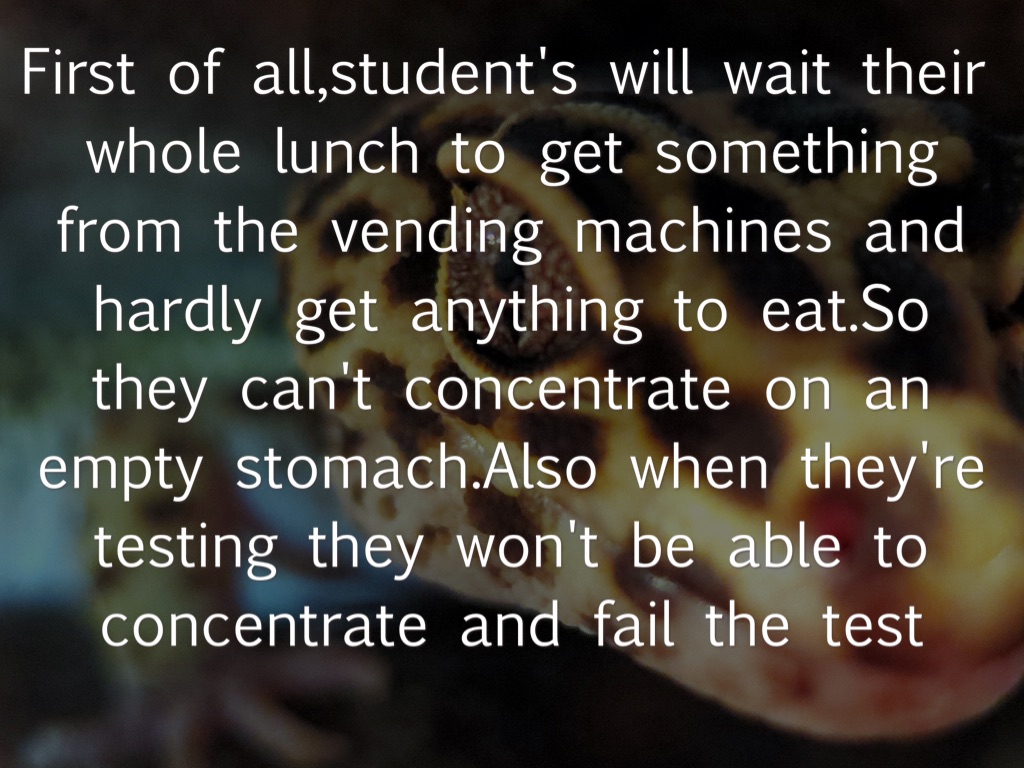 First of all,student's will wait their whole lunch to get something from the vending machines and hardly get anything to eat.So they can't concentrate on an empty stomach.Also when they're testing they won't be able to concentrate and fail the test