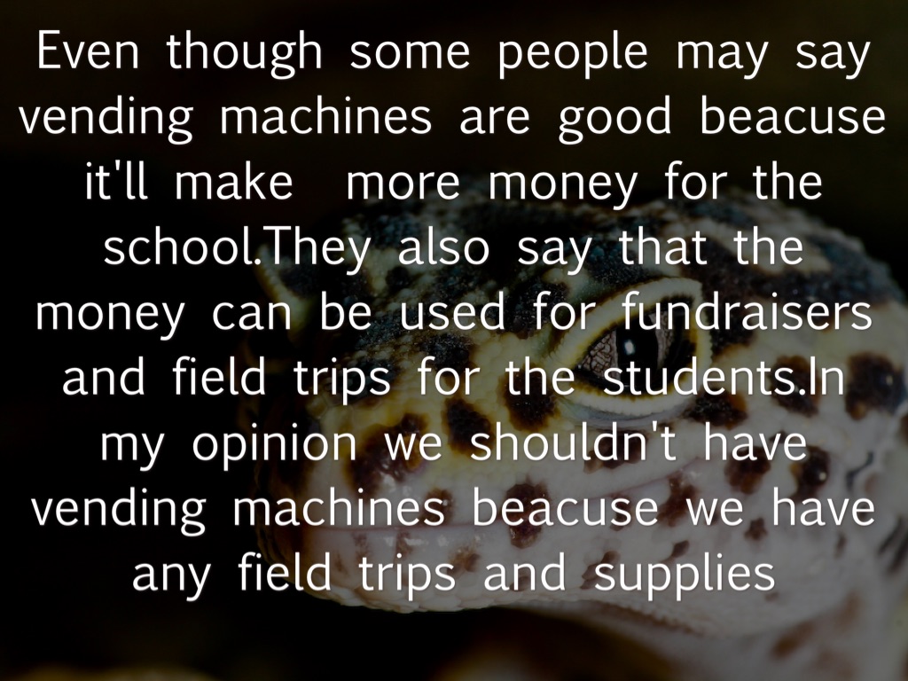 Even though some people may say vending machines are good beacuse it'll make more money for the school.They also say that the money can be used for fundraisers and field trips for the students.In my opinion we shouldn't have vending machines beacuse we have any field trips and supplies