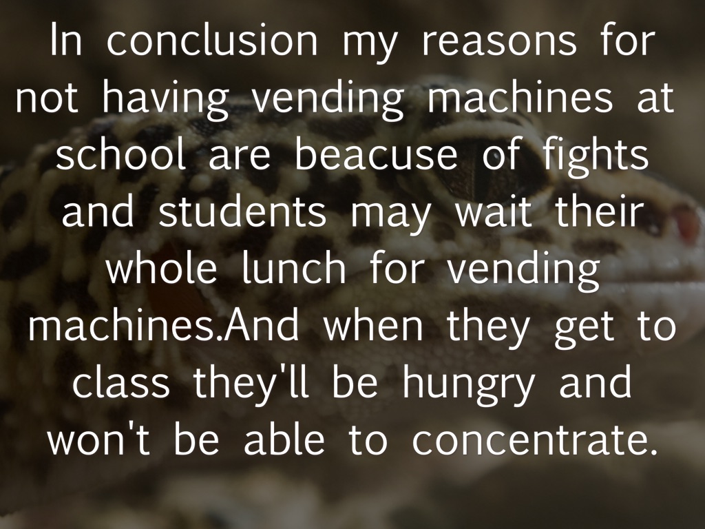 In conclusion my reasons for not having vending machines at school are beacuse of fights and students may wait their whole lunch for vending machines.And when they get to class they'll be hungry and won't be able to concentrate.