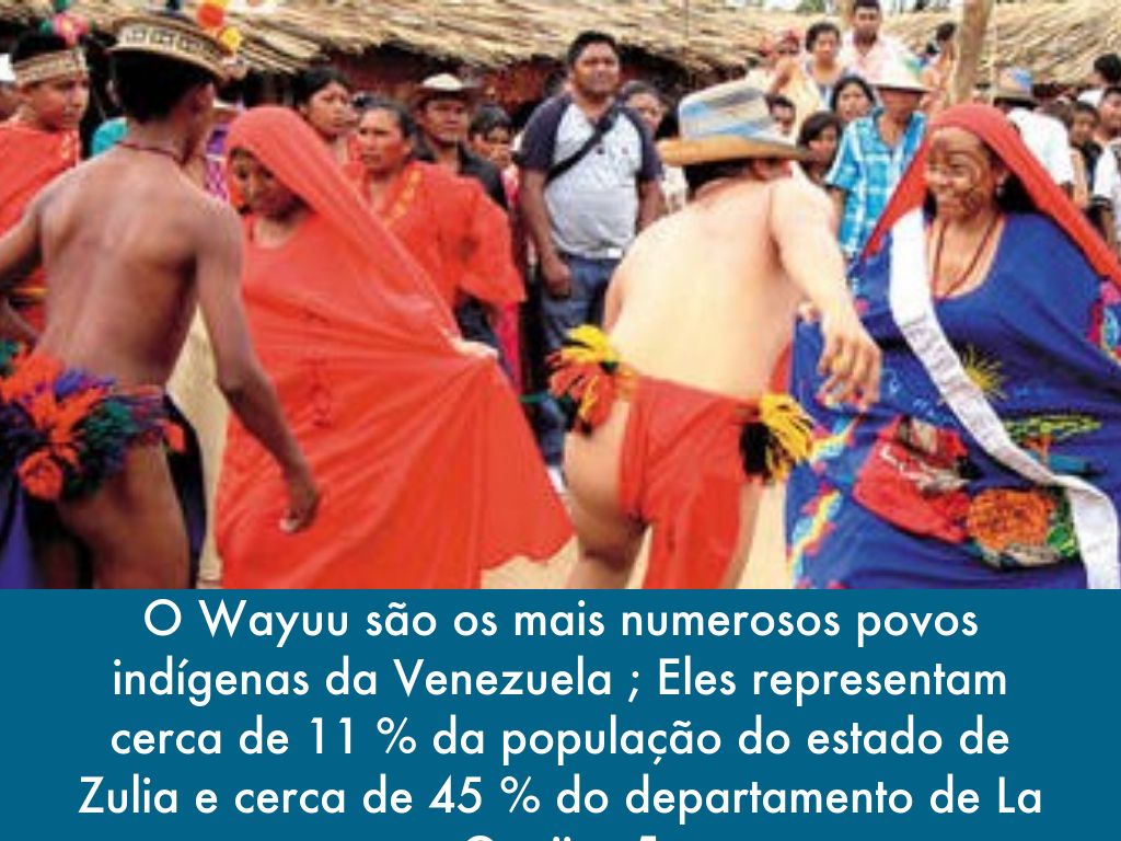 O Wayuu são os mais numerosos povos indígenas da Venezuela ; Eles representam cerca de 11 % da população do estado de Zulia e cerca de 45 % do departamento de La Guajira.5