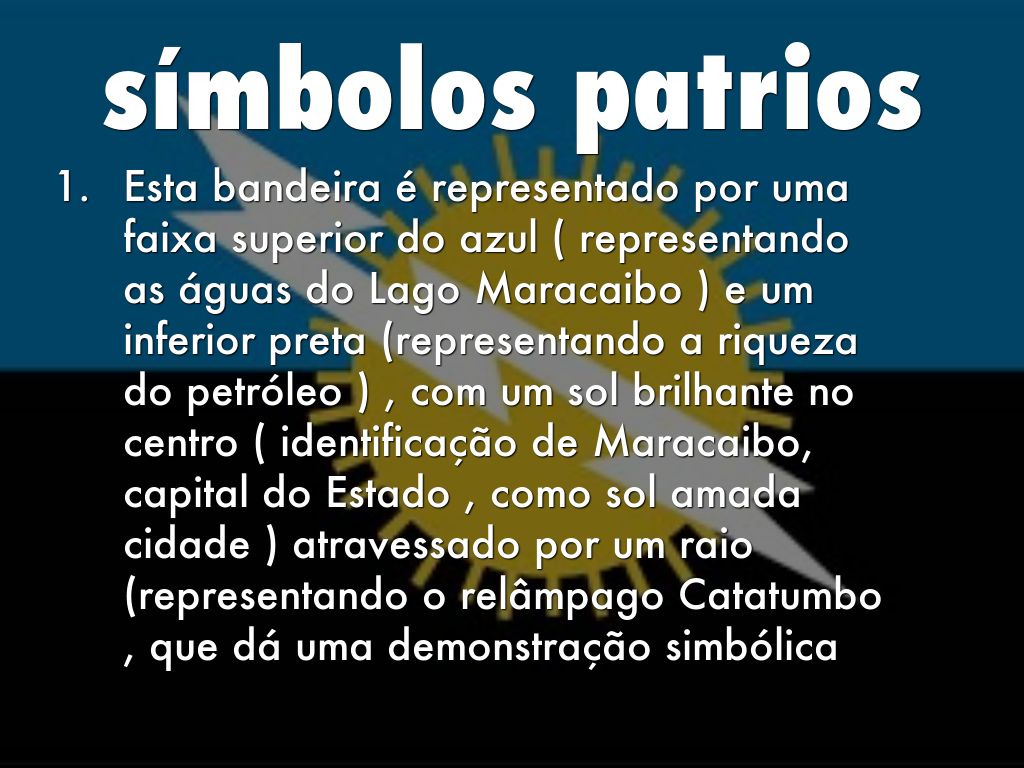 - Esta bandeira é representado por uma faixa superior do azul ( representando as águas do Lago Maracaibo ) e um inferior preta (representando a riqueza do petróleo ) , com um sol brilhante no centro ( identificação de Maracaibo, capital do Estado , como sol amada cidade ) atravessado por um raio (representando o relâmpago Catatumbo , que dá uma demonstração simbólica do poder da natureza ) .