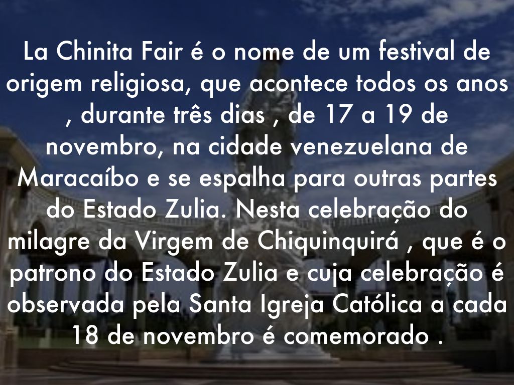 La Chinita Fair é o nome de um festival de origem religiosa, que acontece todos os anos , durante três dias , de 17 a 19 de novembro, na cidade venezuelana de Maracaíbo e se espalha para outras partes do Estado Zulia. Nesta celebração do milagre da Virgem de Chiquinquirá , que é o patrono do Estado Zulia e cuja celebração é observada pela Santa Igreja Católica a cada 18 de novembro é comemorado .