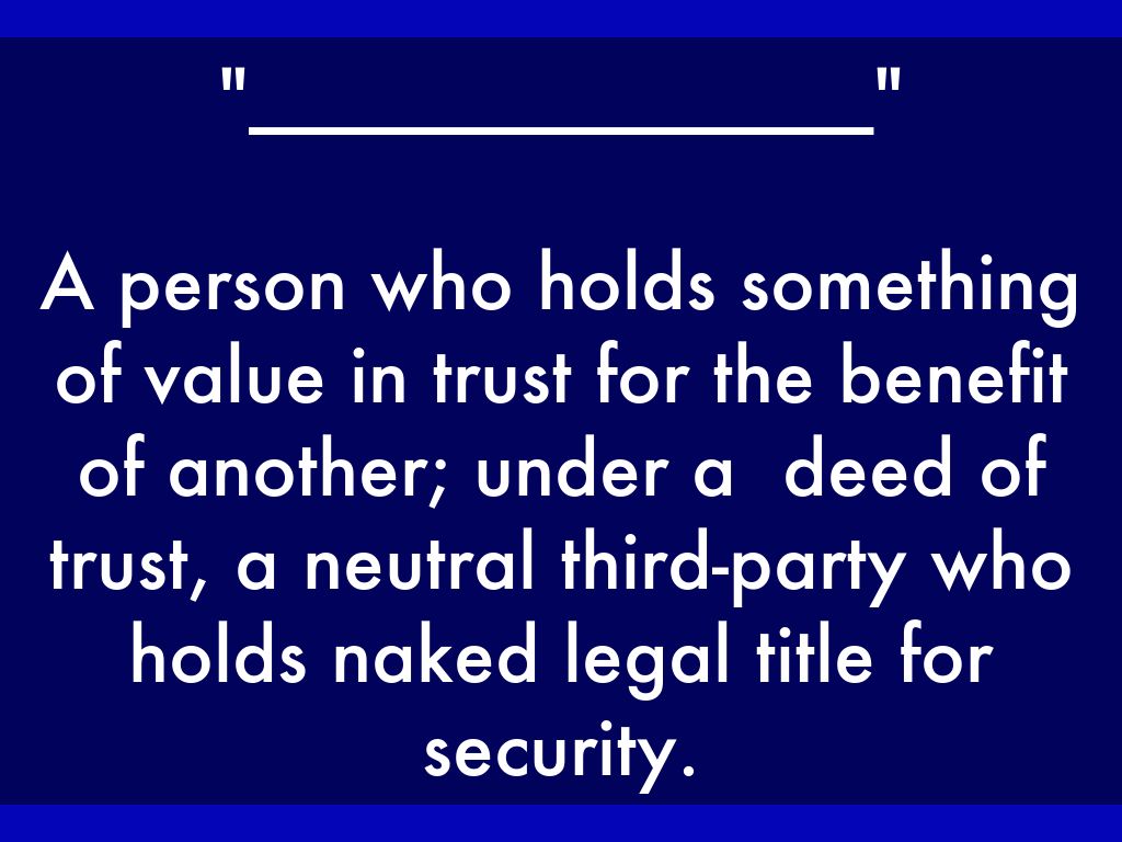 A person who holds something of value in trust for the benefit of another; under a deed of trust, a neutral third-party who holds naked legal title for security.