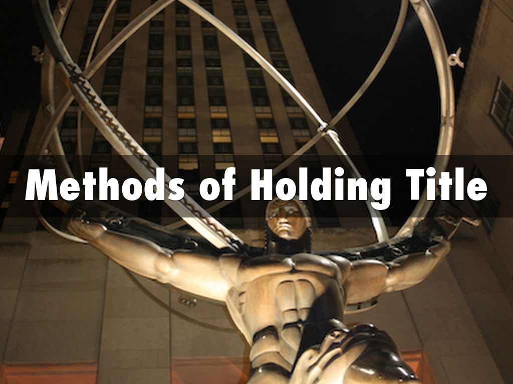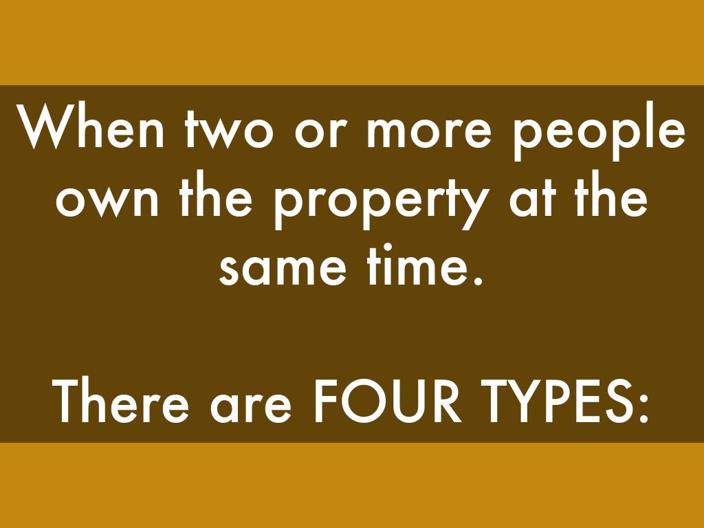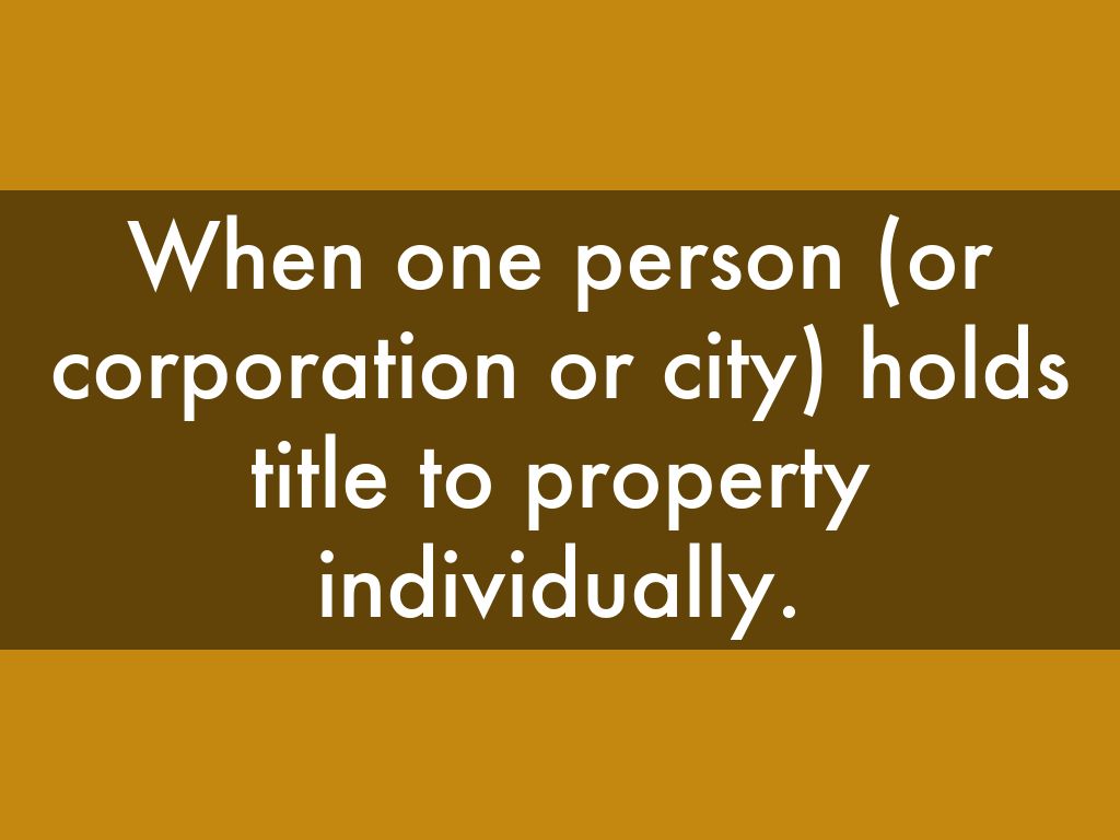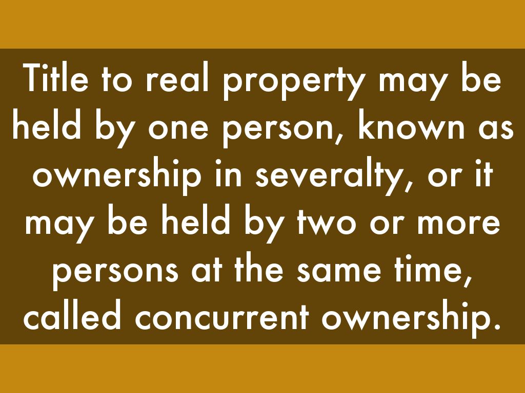 Title to real property may be held by one person, known as ownership in severalty, or it may be held by two or more persons at the same time, called concurrent ownership.