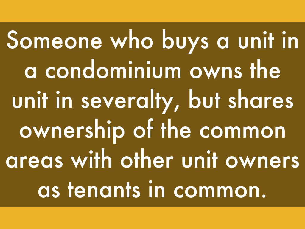 Someone who buys a unit in a condominium owns the unit in severalty, but shares ownership of the common areas with other unit owners as tenants in common.