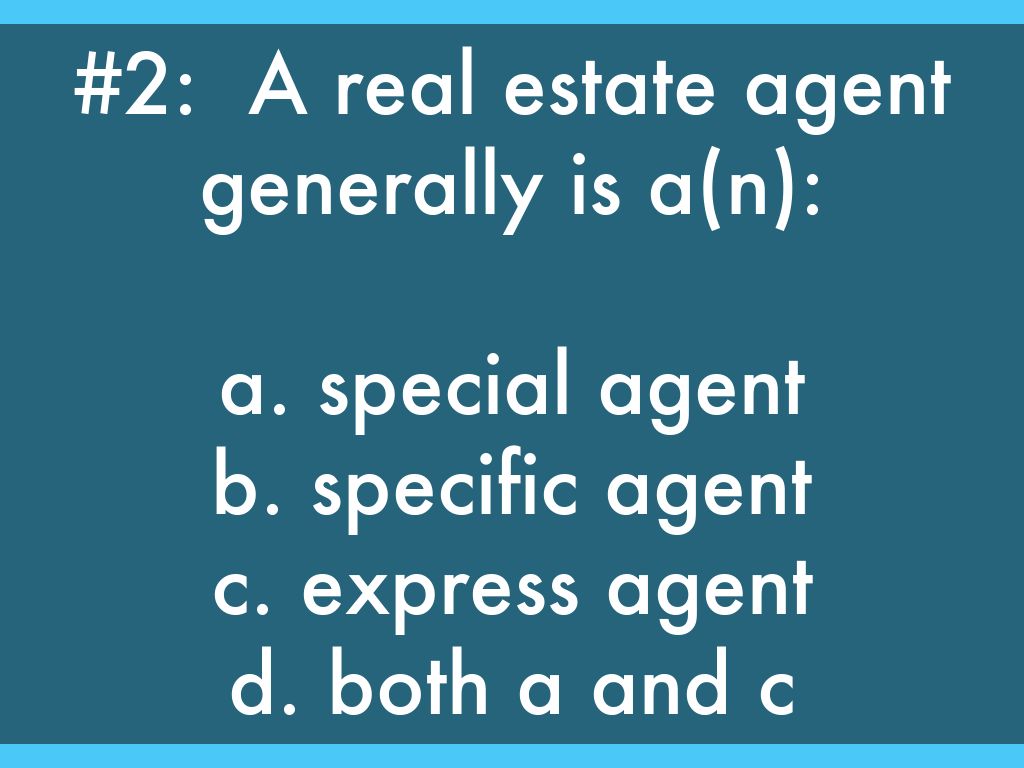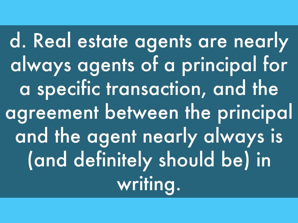 d. Real estate agents are nearly always agents of a principal for a specific transaction, and the agreement between the principal and the agent nearly always is (and definitely should be) in writing.