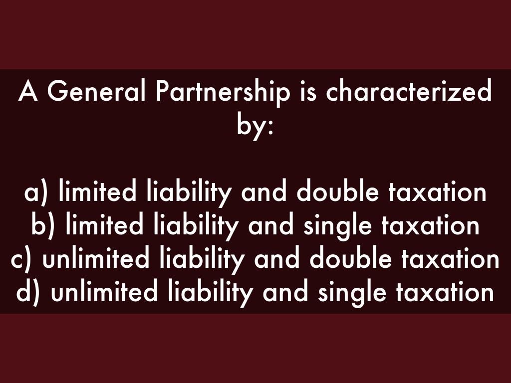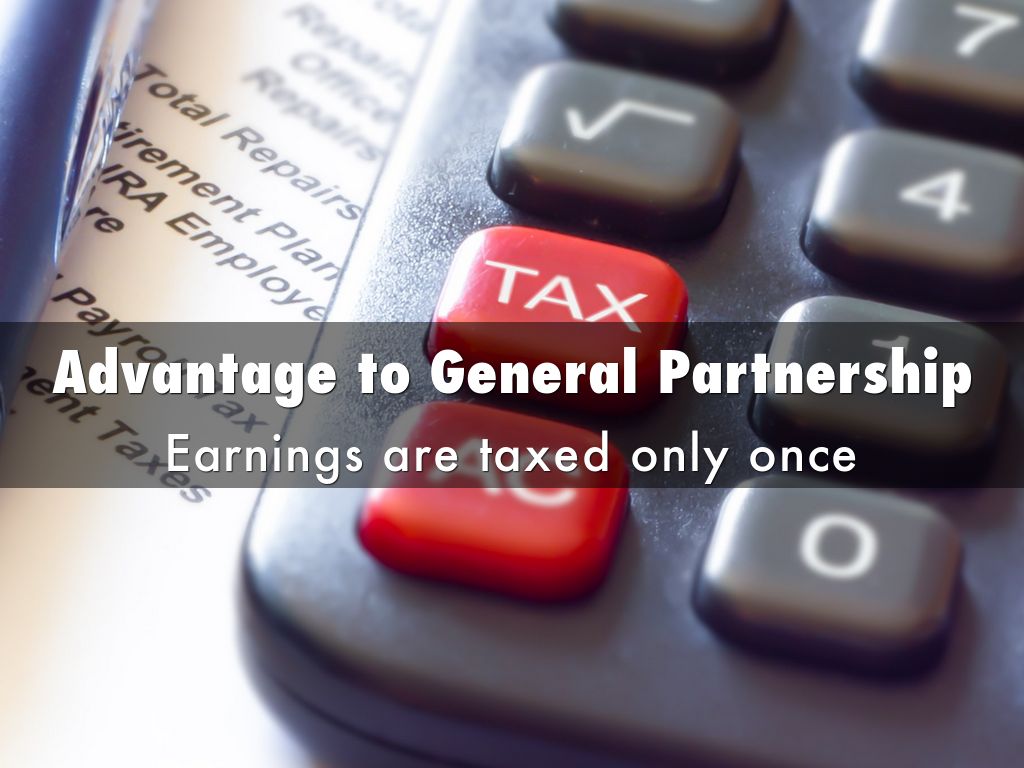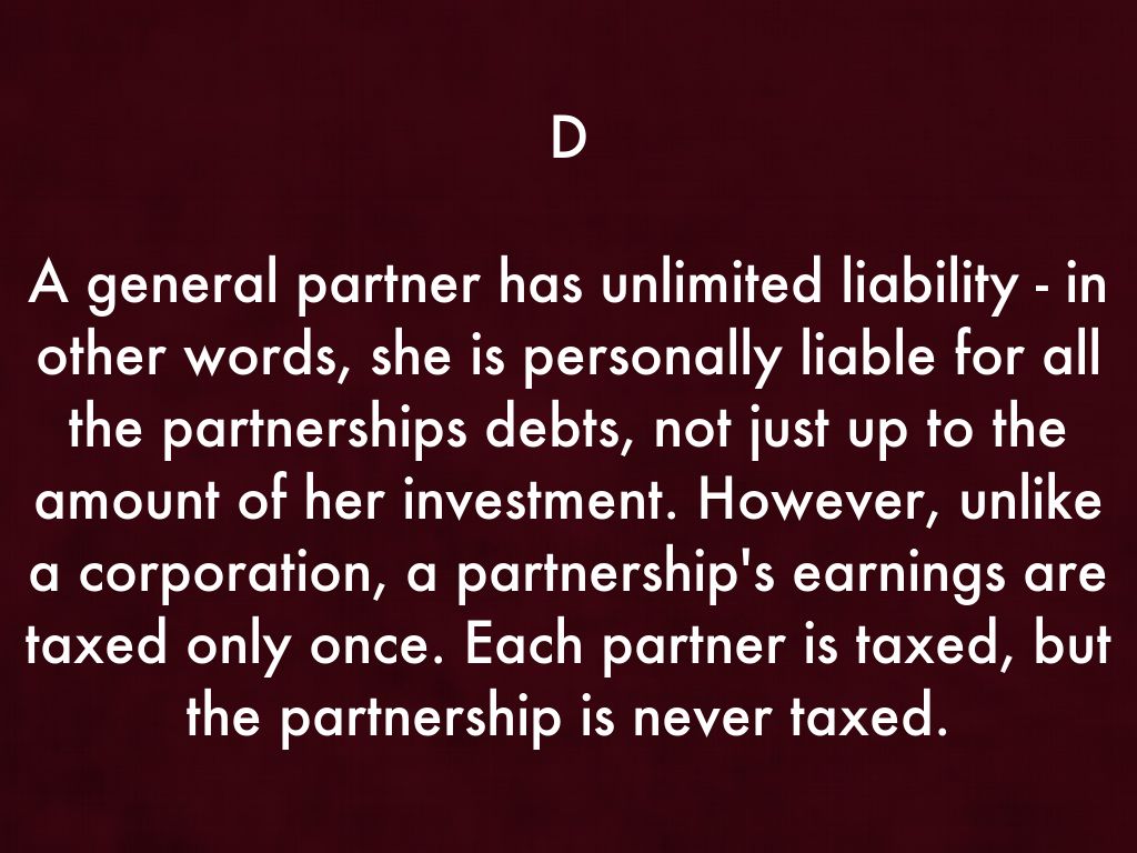 A general partner has unlimited liability - in other words, she is personally liable for all the partnerships debts, not just up to the amount of her investment. However, unlike a corporation, a partnership's earnings are taxed only once. Each partner is taxed, but the partnership is never taxed.