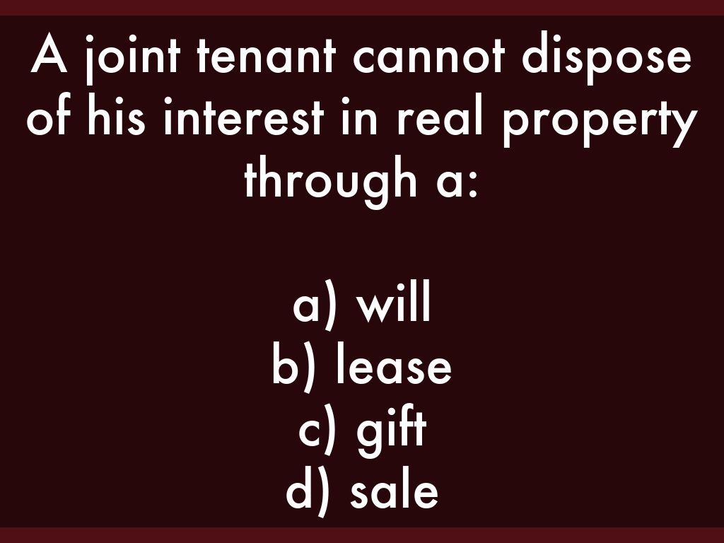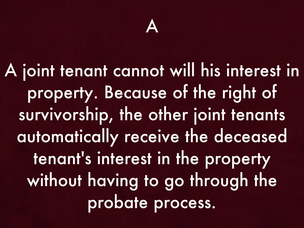 A joint tenant cannot will his interest in property. Because of the right of survivorship, the other joint tenants automatically receive the deceased tenant's interest in the property without having to go through the probate process.