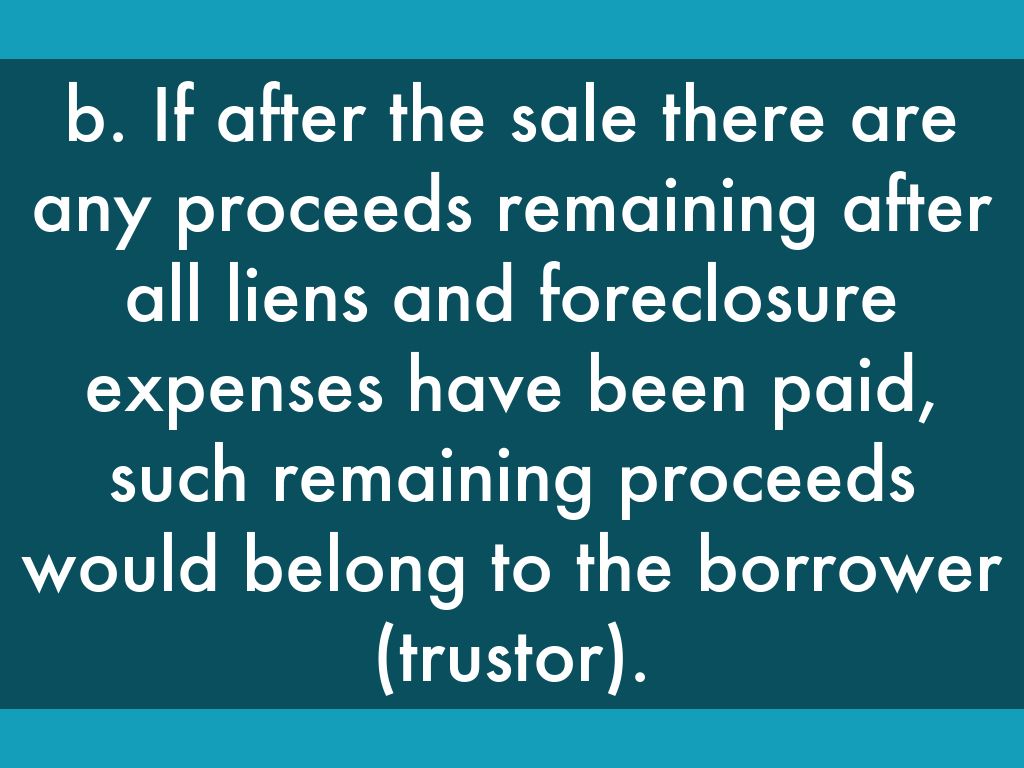 b. If after the sale there are any proceeds remaining after all liens and foreclosure expenses have been paid, such remaining proceeds would belong to the borrower (trustor).