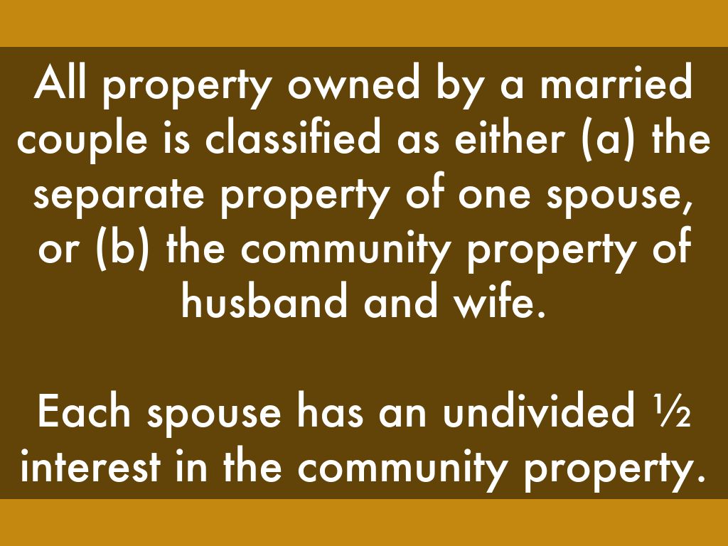 All property owned by a married couple is classified as either (a) the separate property of one spouse, or (b) the community property of husband and wife.