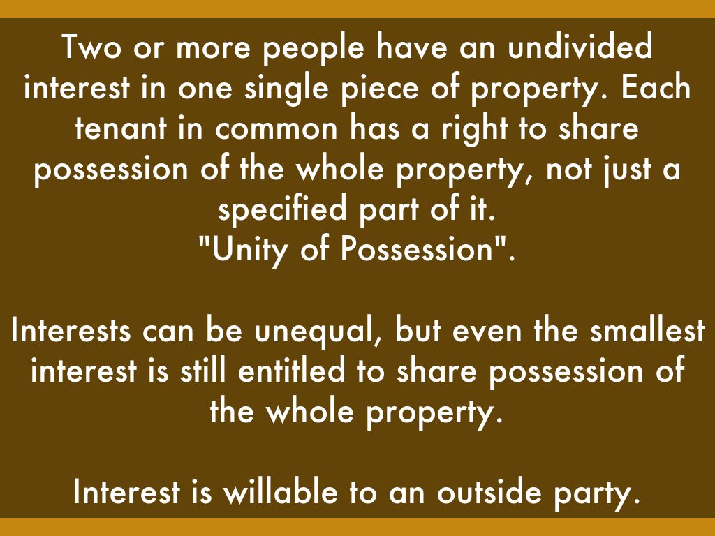 Two or more people have an undivided interest in one single piece of property. Each tenant in common has a right to share possession of the whole property, not just a specified part of it.
