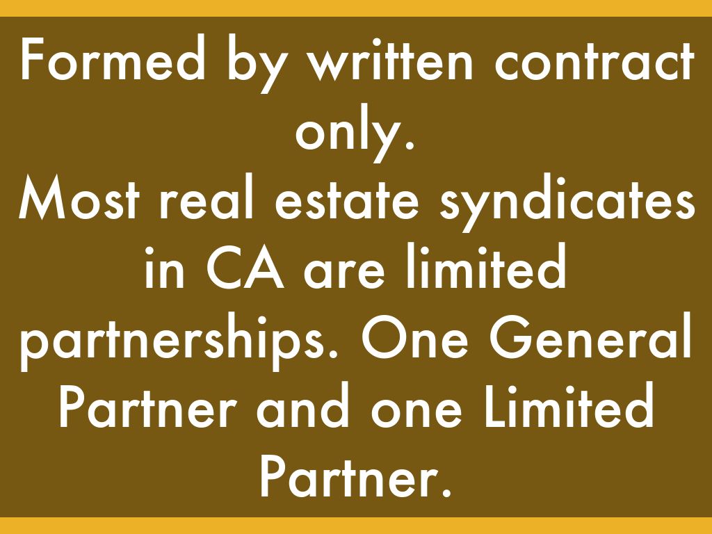 Most real estate syndicates in CA are limited partnerships. One General Partner and one Limited Partner.