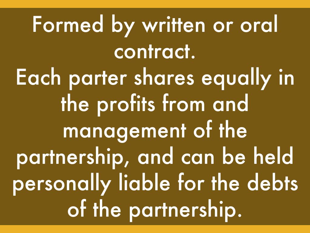 Each parter shares equally in the profits from and management of the partnership, and can be held personally liable for the debts of the partnership.