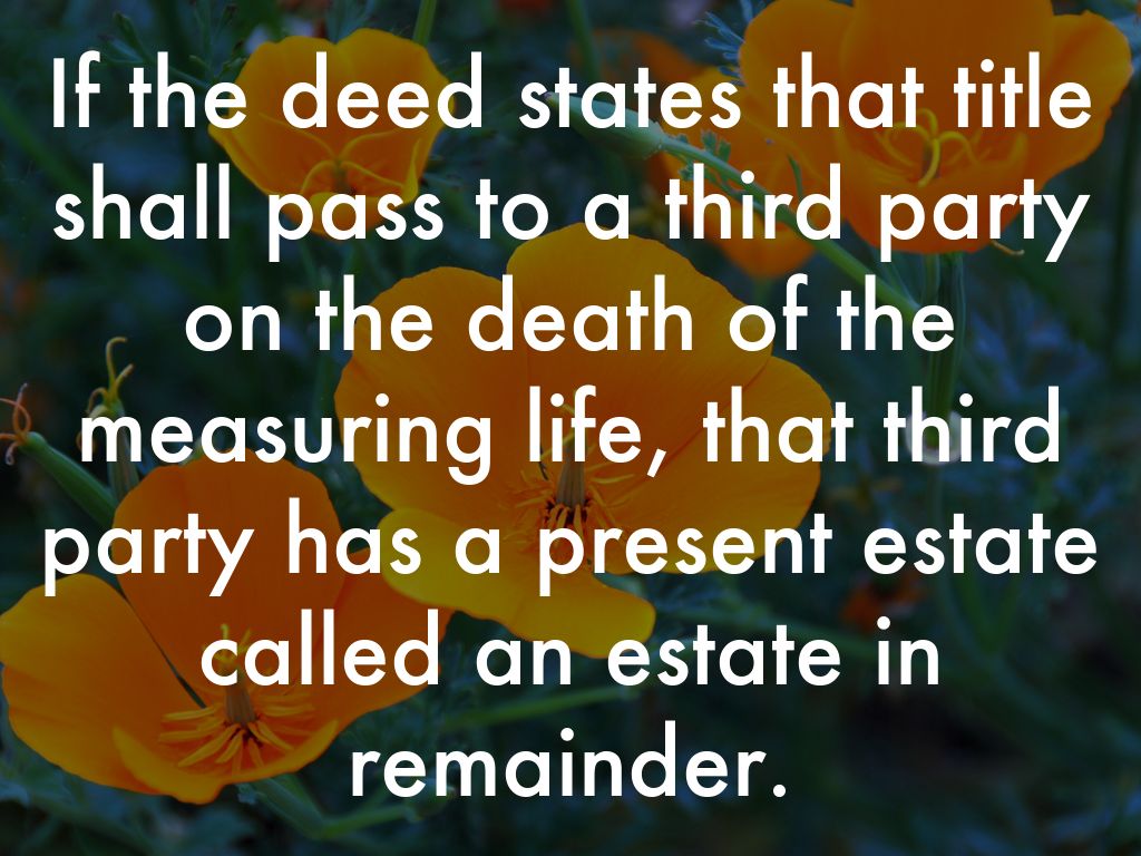 If the deed states that title shall pass to a third party on the death of the measuring life, that third party has a present estate called an estate in remainder.