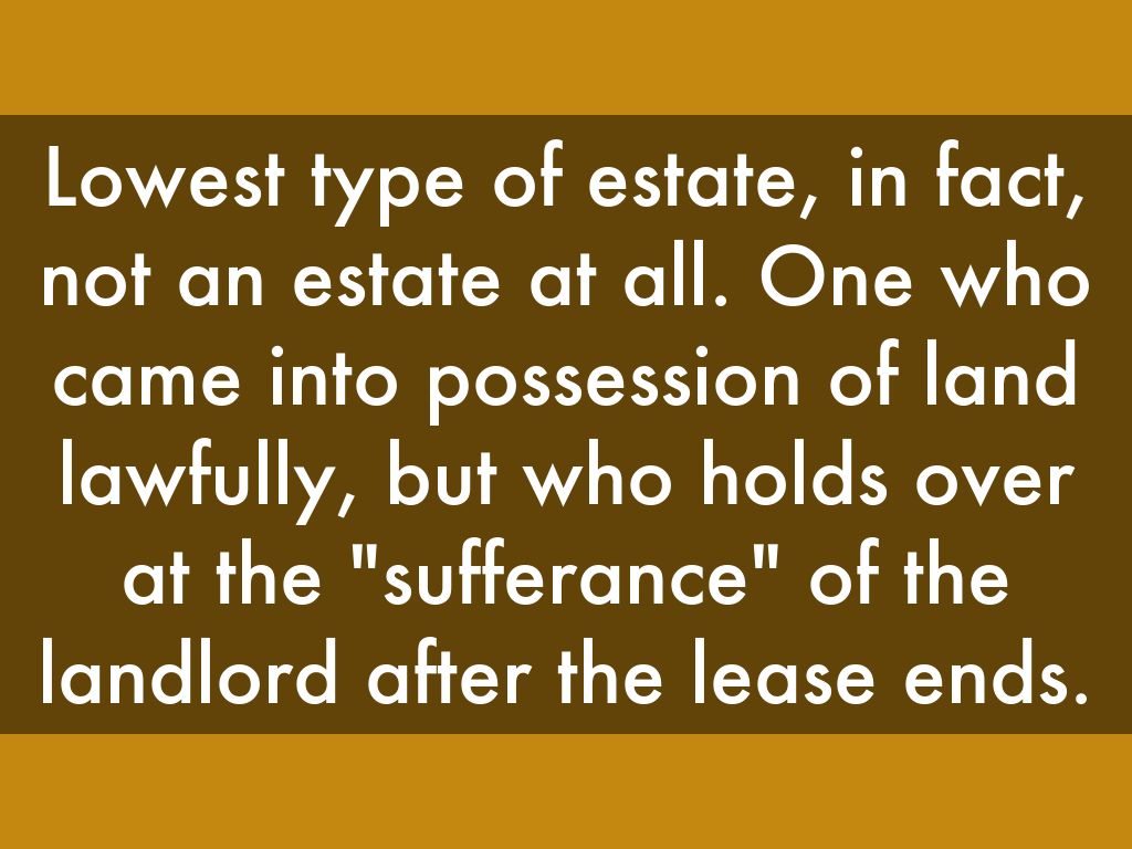 Lowest type of estate, in fact, not an estate at all. One who came into possession of land lawfully, but who holds over at the "sufferance" of the landlord after the lease ends.