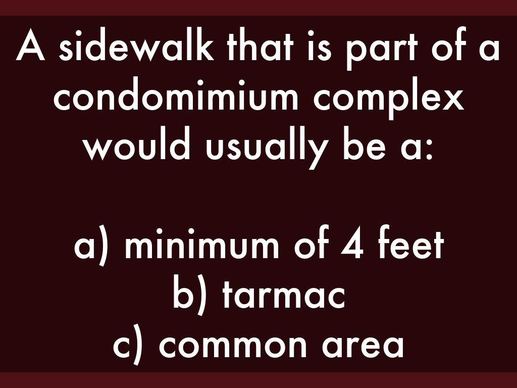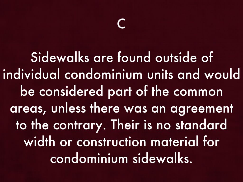 Sidewalks are found outside of individual condominium units and would be considered part of the common areas, unless there was an agreement to the contrary. Their is no standard width or construction material for condominium sidewalks.