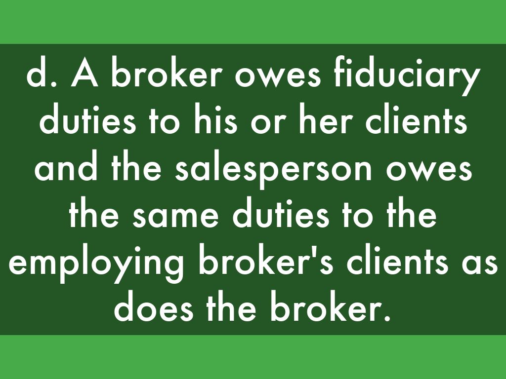 d. A broker owes fiduciary duties to his or her clients and the salesperson owes the same duties to the employing broker's clients as does the broker.