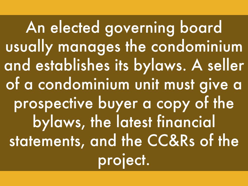 An elected governing board usually manages the condominium and establishes its bylaws. A seller of a condominium unit must give a prospective buyer a copy of the bylaws, the latest financial statements, and the CC&Rs of the project.