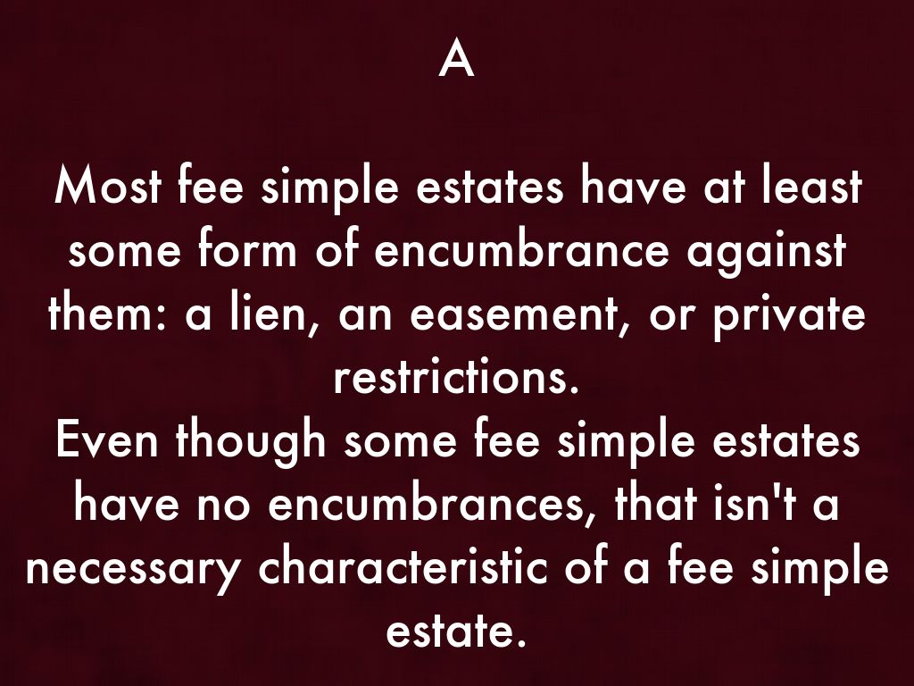 Most fee simple estates have at least some form of encumbrance against them: a lien, an easement, or private restrictions.
